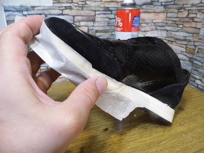 Заклеиваем маляркой свежеотмытую подошву и запшЫкиваем замшу из баллона краской для замши.