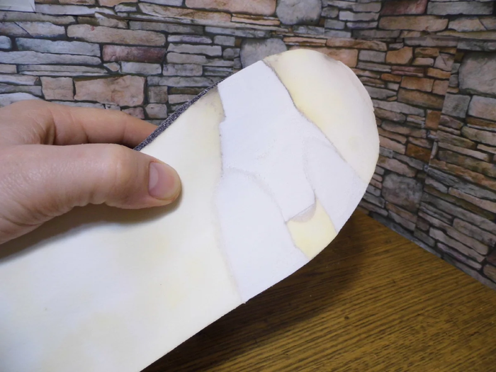 Итак, приступаем! Зачищаем ходовую поверхность, особое внимание уделяя краям. Там должна быть чётко выраженная грань, без закругления! В середине же эти пупырышки можно даже полностью и не срезать. Впадины между ними заполнятся клеем. Плюс они придадут некоторую толщину и упругость - меньше будут чувствоваться камешки. Вот, верхняя полупара уже зачищена.