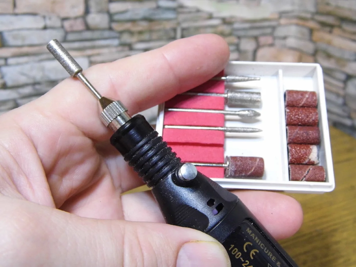 Порошок следует растворить, готовые жидкости применяем сразу. У меня порошок, потому что жидкость имеет ограниченный срок годности, используется обычно на больших объёмах. Тем временем берём специнструмент (отжатый у девочек). Зачищаем места приклейки.