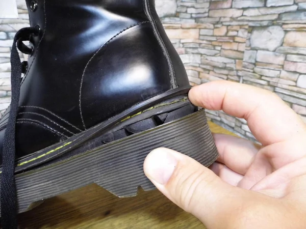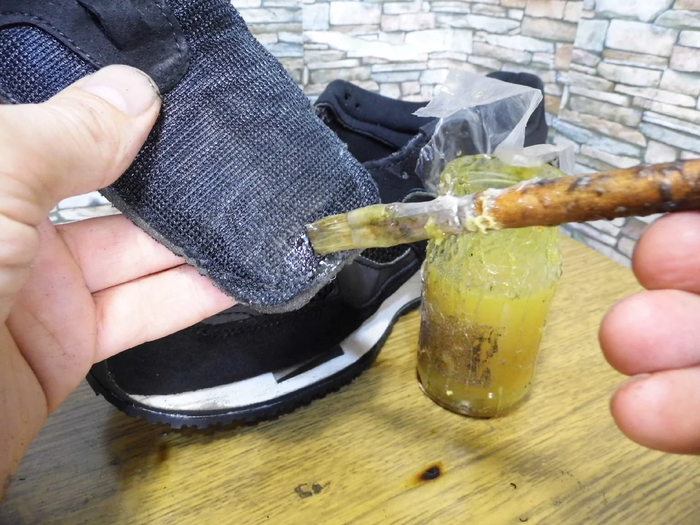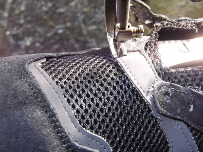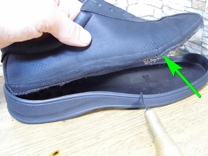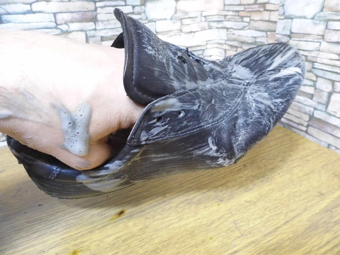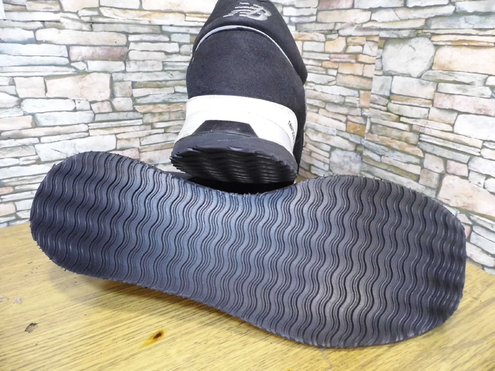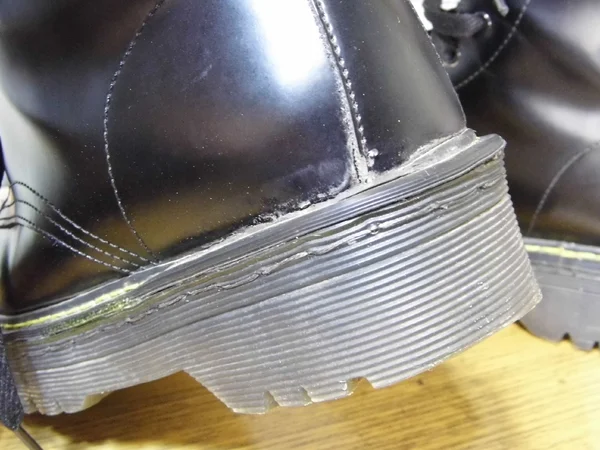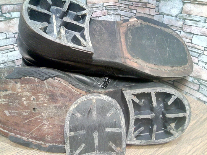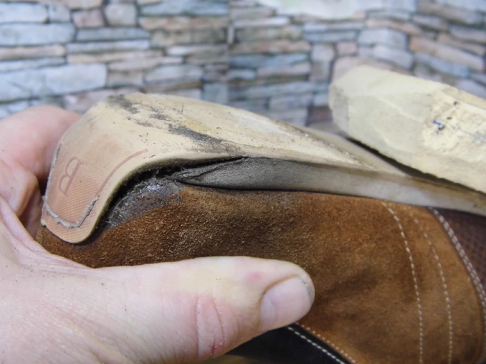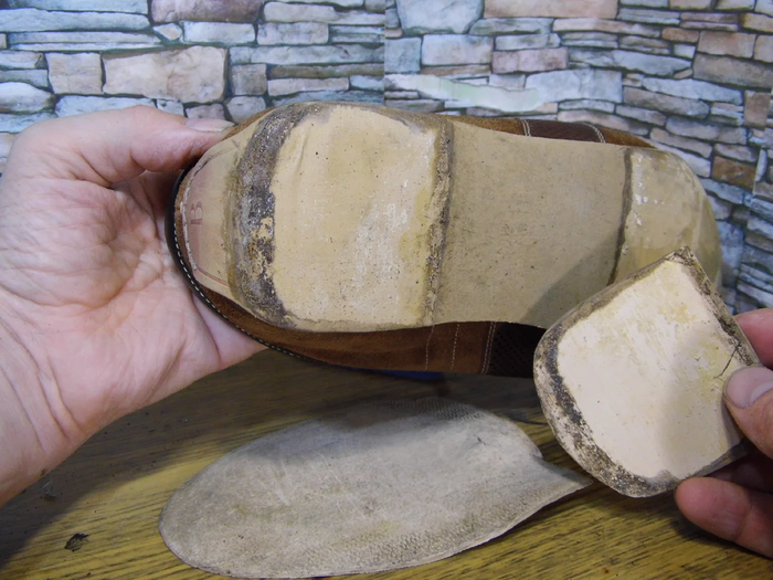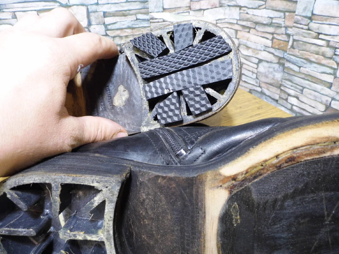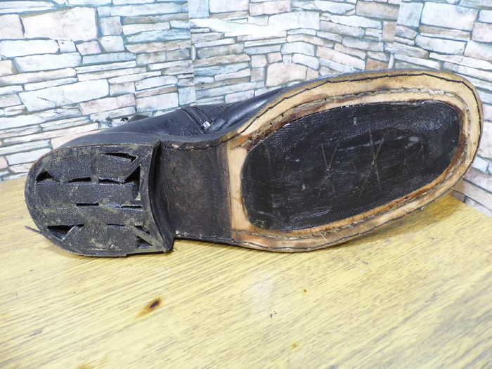 Сняли. И опа! Кожаная подошва цела! Эта полоса - просто след от грязи / пыли, которая проникла в трещину. В дальнейшем, в принципе, именно в этом месте кожа бы могла пропитаться водой с прочим шлаком и треснуть уже по-настоящему.