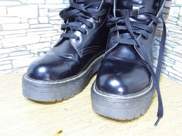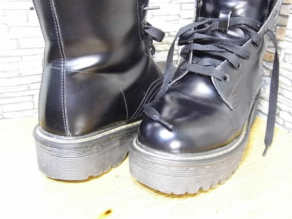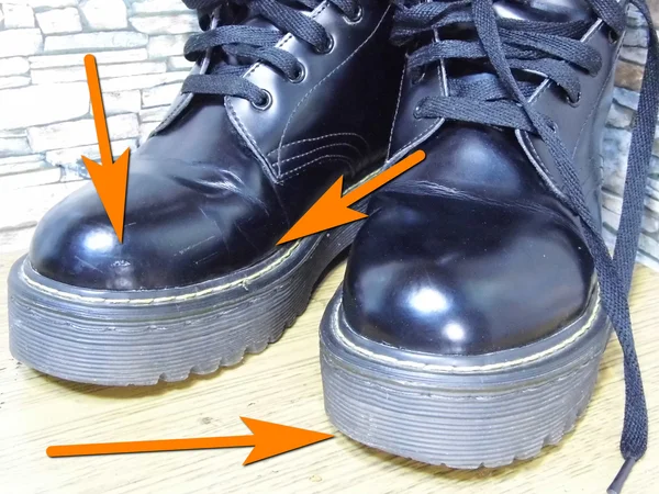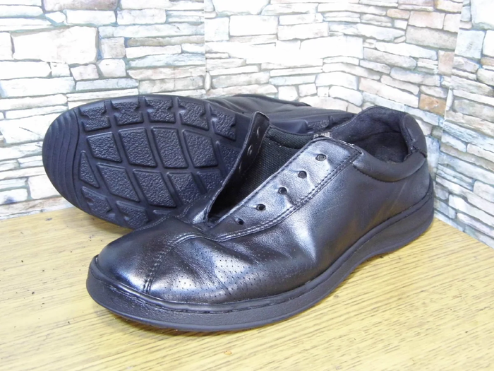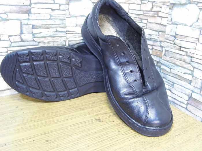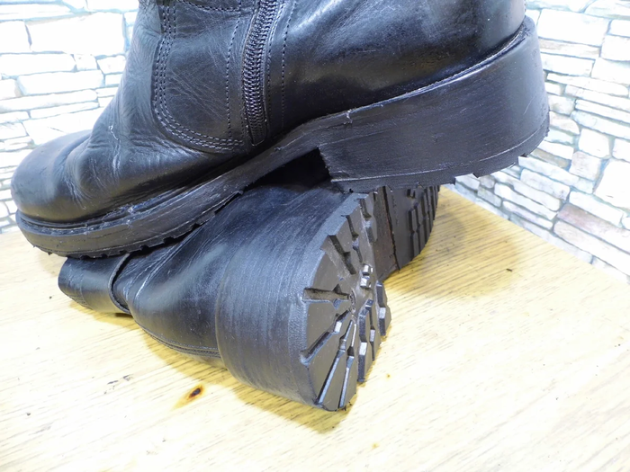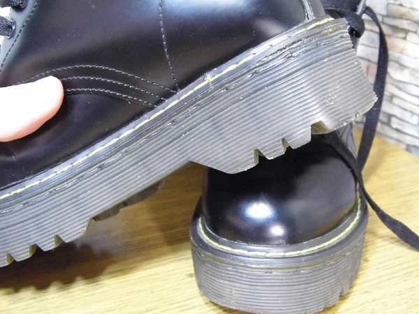 Как обычно, внезапно. Обратим внимание на конструкцию обуви. Верх чёрный (причём комбинированный), подошва коричневая. Низ - чёрный. Причём передняя часть с достаточно выраженным рисунком, набойка - плоская, комбинированная кожа и износоустойчивая часть.