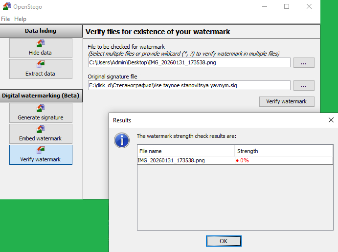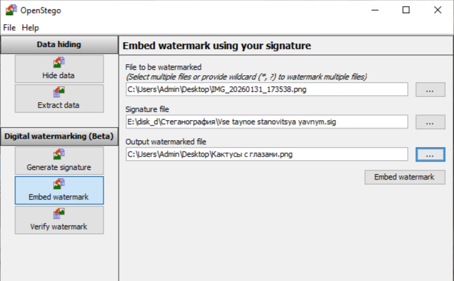 Дальше я добавляю стеганографический шум на оригинальное изображение, выбирая его и файл подписи: