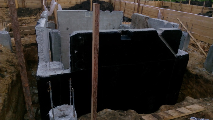 Это частный дом. Панели с 9 этажки, арматурой со стороны овощной ямы для восприятия давления грунта. Понятное дело обработано праймером и наклеена гидроизоляция.