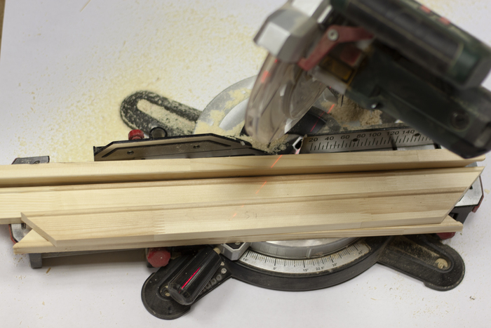 Итак, предположим, Вам нужно натянуть картину маслом или принт на холсте на подрамник. Если рейка подрамника у вас есть, то то просто режем ее на части необходимой длины под углом 45 градусов: