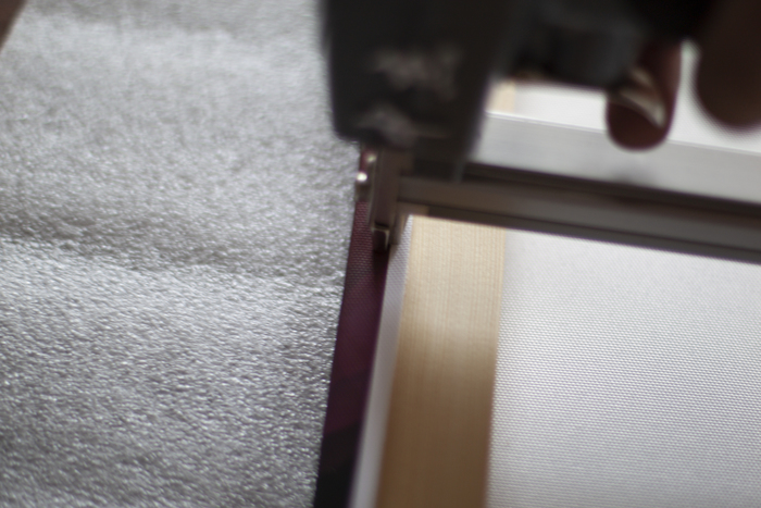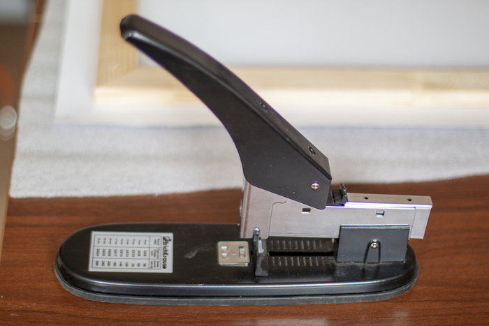 Кладем на него подрамник и прихватываем его с одной стороны (фото плохое, потому что держать степлер и фотографировать крайне неудобно. Даже не пробуйте, просто поверьте на слово):