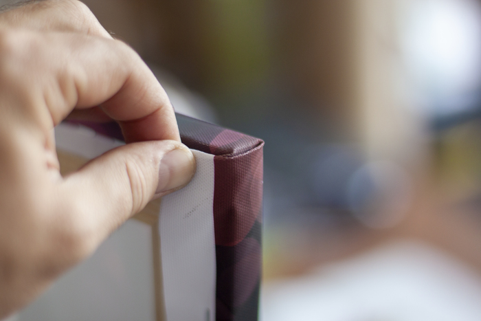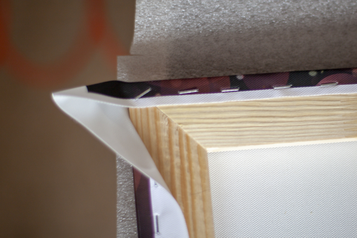 Натягиваем-прибиваем. А вот с углами сложнее. В этом проекте я использую галерейную натяжку, т.е. картина будет использоваться без багета, значит, торцы должны быть красивыми.