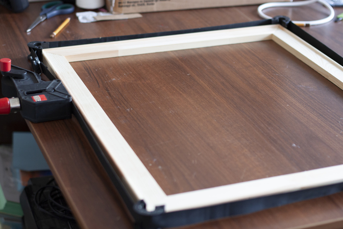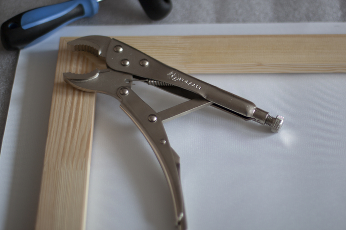 Я зажимаю подрамник струбциной Bessey, но можно использовать нонейм из строительного или даже стяжку для груза. Импровизируйте!
