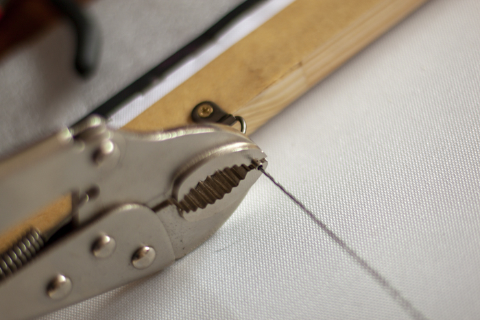 Важно: не нужно вбивать скобки в одну линию, подрамник может расколоться по волокнам. Перфекционисты, молчать, так надо. Нужно закрепить одну сторону холста и начать натяжку на другой стороне, прямо напротив: