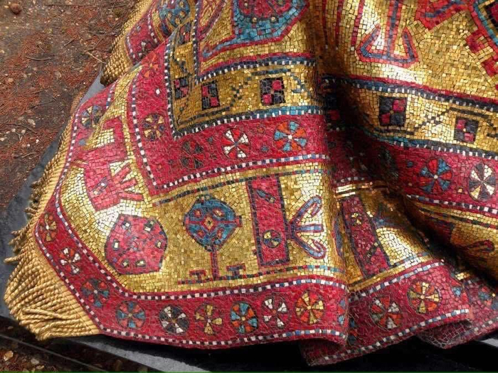 Эскизы ковра, выполненные Энцо Фриджерио, точно повторяли один из любимых восточных ковров из коллекции Нуриева. Воспроизвести ковер в красках, с визуальным эффектом тканевой текстуры было решено с помощью мозаики. Мозаика решила и проблему воспроизведения изящных складок ниспадающего ковра, и обеспечила естественный вид нитям золотой бахромы.
