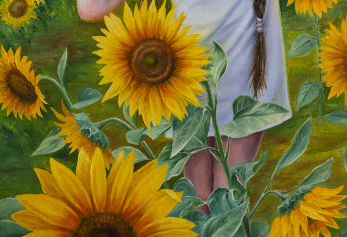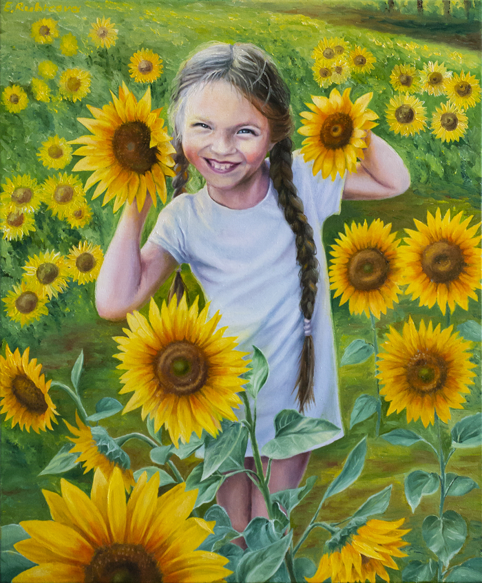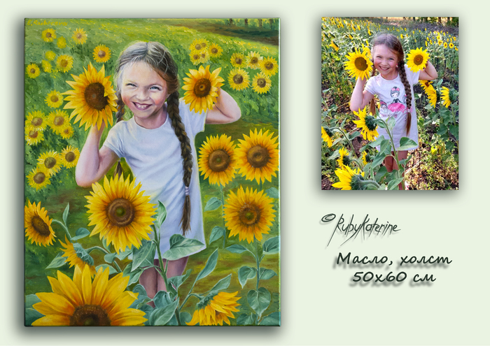 Это был долгий и трудный портрет. Я извелась, пока писала. То, что фото-реф сделано на тапочек - мелочи, это каждое первое на портрет присылают. Вроде и девчонка такая клевая, и сама идея солнечная, теплая, а вот поди ж ты - не пишется и все тут. Цветы эти еще. И надоели, и бросить нельзя. Все прокляла, пока закончила)).