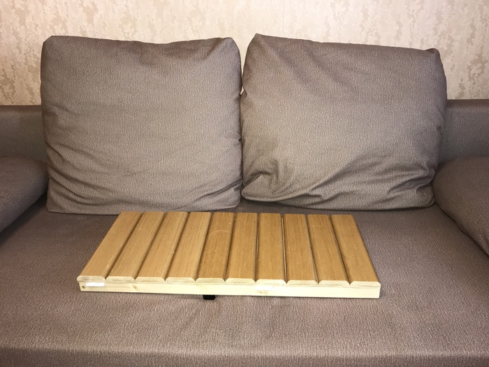 После, приступаем к изготовлению ножек. Ножки изготовлены из того же бруса что и каркас столешницы. Края ножек закругляем, чтобы они не портили покрытие дивана. Ножки соединяем друг с другом, чтобы получилась структура форма "Н". Результат ниже: