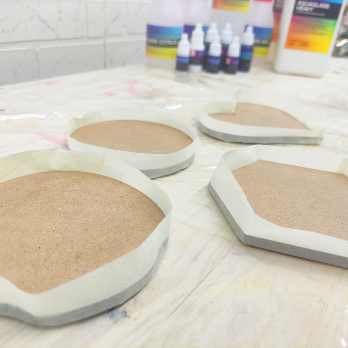 1. Взяла набор артбордов для подстаканников из МДФ. Обклеила по бокам малярным скотчем.