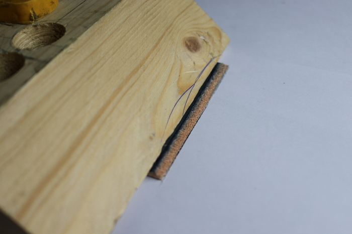 Собирать сам корпус подсумка решил встык, срезав углы деталей под 45 градусов. Предварительно пробиваю отверстия, затем срезаю при помощи бруска с отпиленным под 45 градусов краем.