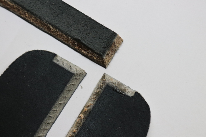 Корпус подсумка состоит из пяти деталей: клапан, верх, две стенки, задняя часть. На верхнюю часть ставлю кнопки. Стенки, верх, заднюю часть обрабатываю так, чтобы они соединились краями под 45 градусов.