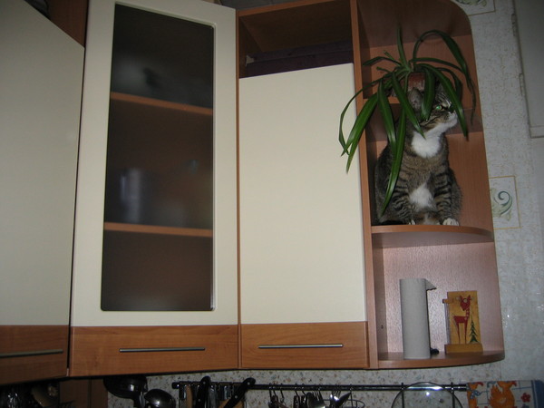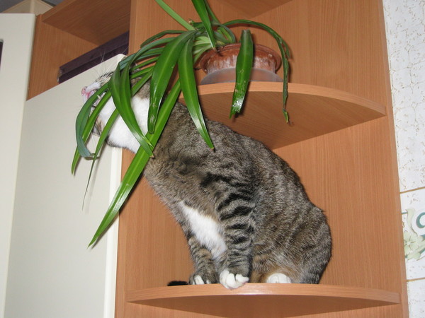 Переставили все цветочные горшки с подоконников на полки повыше, но и там нет спасения от его зубов!