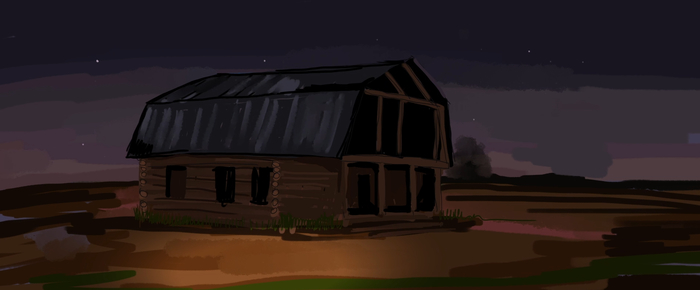 Поэтому вырубив телефон, я, уже медленно и осторожно продолжал приближался к дому. Еще через пару минут стало понятно, что дорогу мне преграждает забор из черного железного профлиста, а еще через минуту я разглядел приоткрытую калитку и не мешкая вошёл на территорию. Здесь дом уже можно было разглядеть получше, темные прорези окон, нависающая огромная несоразмерная крыша, а также дверь, чернее чем все остальное в этом месте.