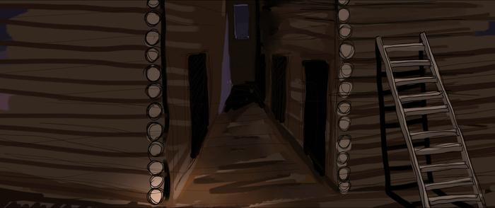 Не раздумывая я толкнул эту чёрную дверь и шагнул в темноту. Под моими ногами оказался твёрдый дощатый настил, это было ожидаемо, ведь дом недостроен. Все остальное уже выглядело менее предсказуемо. Ведра, банки с краской, обрезки досок, одним словом какой-то строительный хаос окружал меня со всех сторон. Чуть в глубине был коридор, растворяющийся во мраке, а правее от него контрастный яркий скелет стремянки уходящей вертикально вверх. Но несмотря на это, дом казался готовым к проживанию и если ее держат здесь, то очевидно где-то в одной из комнат, там, в уходящем во мрак, коридоре. В который я и шагнул, смело и без раздумий. Стараясь лишь не задеть чего-либо, осторожно перенося вес тела, чтобы не скрипнула ни одна из досок под моими ногами. Я был спокоен, понимая что ранее утро давало мне форы, и те уроды, что ее здесь держат, наверняка спят.