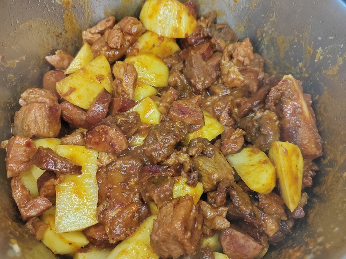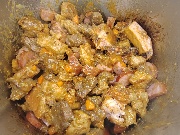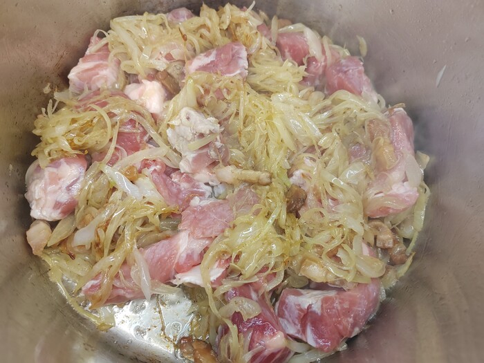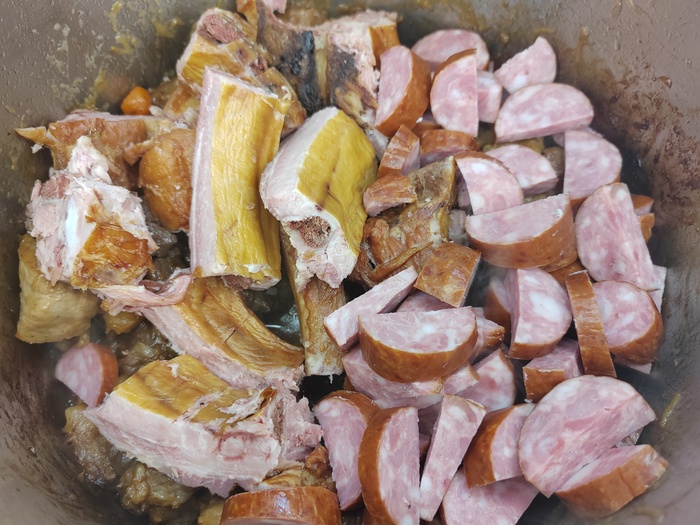 19. Ребра с колбасой туда же. Перемешиваем и тушим/жарим. Внимательно следим за тем, что происходит на дне кастрюли - в месиве довольно много сахара из лука, так что оно может пытаться пригорать - так что, периодически ворошим содержимое кастрюли. Если начало пригорать, можно налить немного воды и деглазироватть все признаки нафиг. Где-то в этот же момент можно поставить кипятится чайник, чтобы был запас горячей воды. Необязательно, но так будет удобнее.