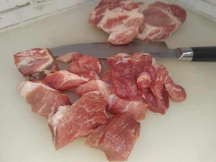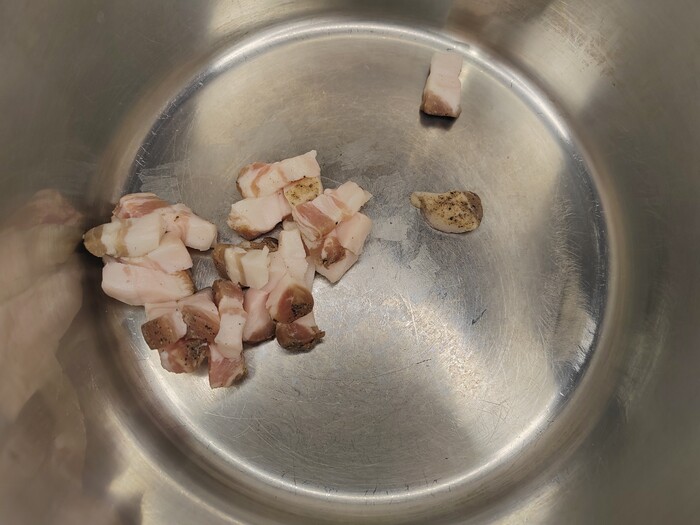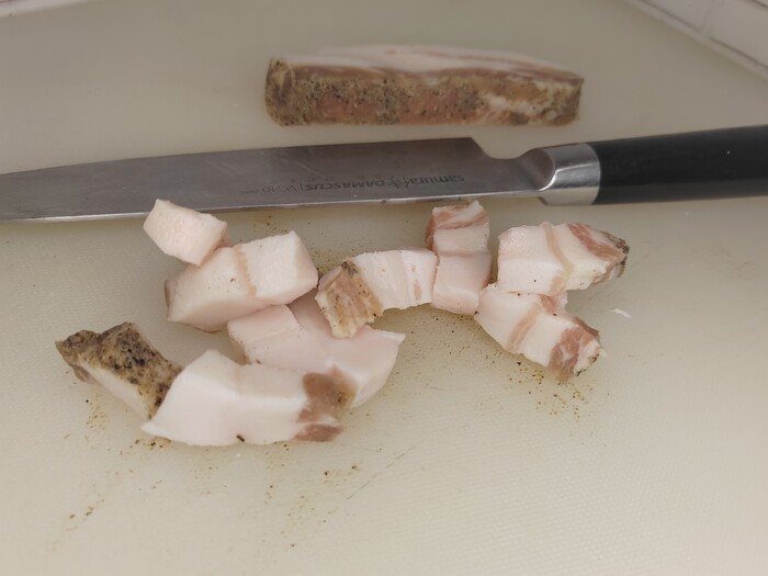 1. Режем сало/шпик/бекон/грудинку. На небольшие (но не совсем микро) кусочки.