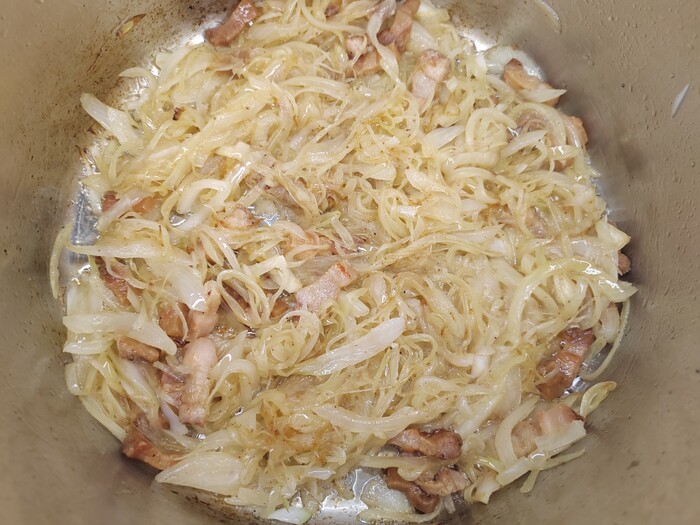 Шпик (в идеале копчёный "венгерский", который в остром перце), или просто мало, или грудинка, или бекон - 150 г;