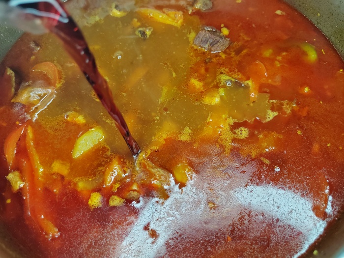 34. Даём закипеть, варим минут пять и выливаем в кастрюлю вино. Даём побулькать ещё минут пять, чтобы алкоголь испарился.
