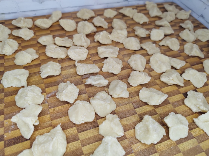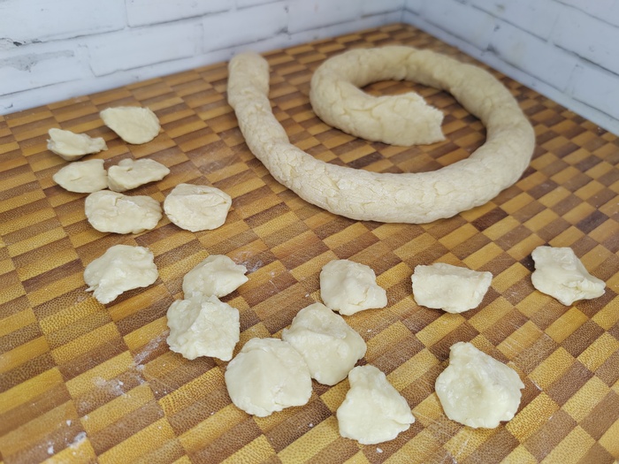 32. Как я понимаю "чипетке" - это что-то, что отщипывают от чего-то единого (хотя я мадьярские речи не понимаю, но пишут так). Так что, и мы этим займёмся - понаотщипываем от жгута небольшие клёцки. И оставим их немного подсохнуть.