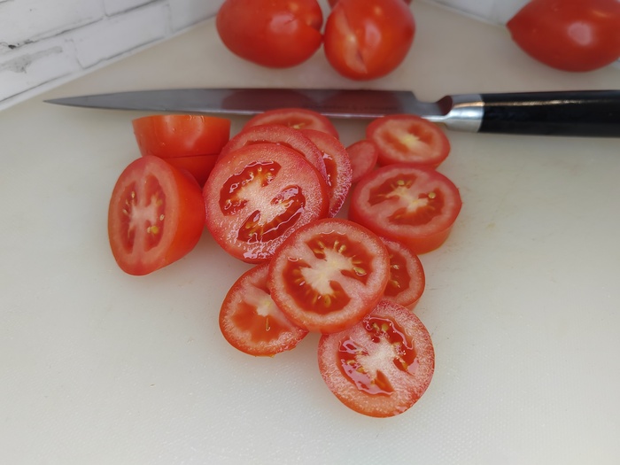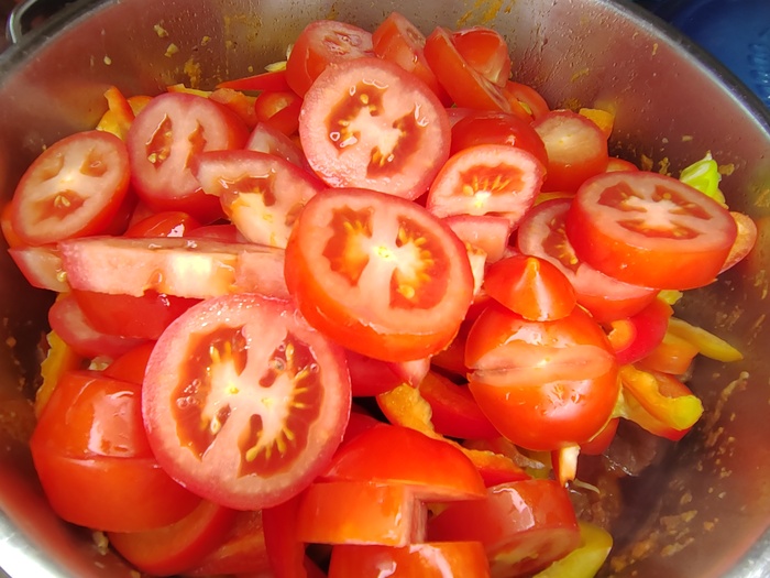 30. Добавляем туда помидоры и перец, закрываем крышкой и всё это прогреваем.