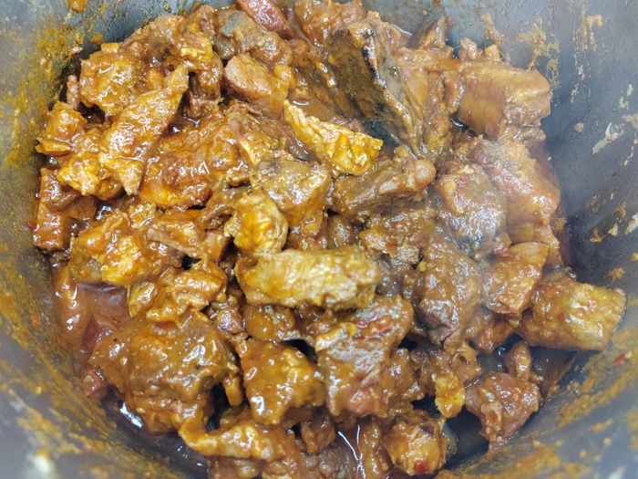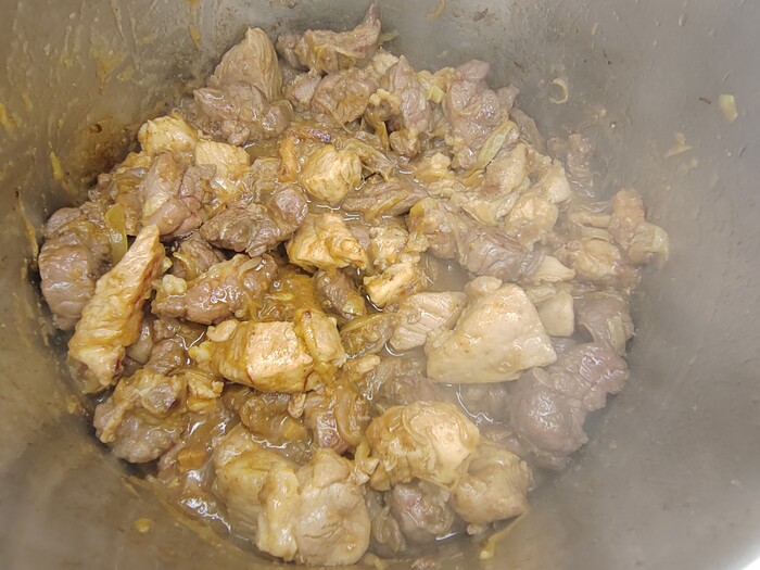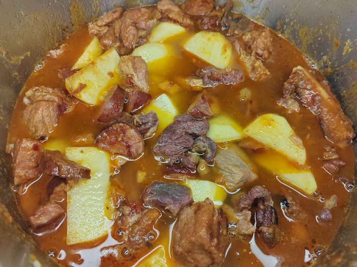 22. Завиваем водой. Чтобы она только-только покрывала (или даже чуть меньше) мясо. И тушим. Час-полтора-два-три. В общем, до желаемой мягкости мяса.