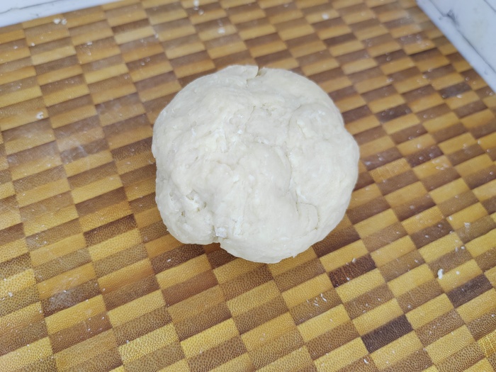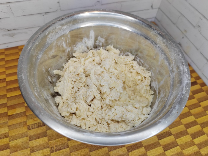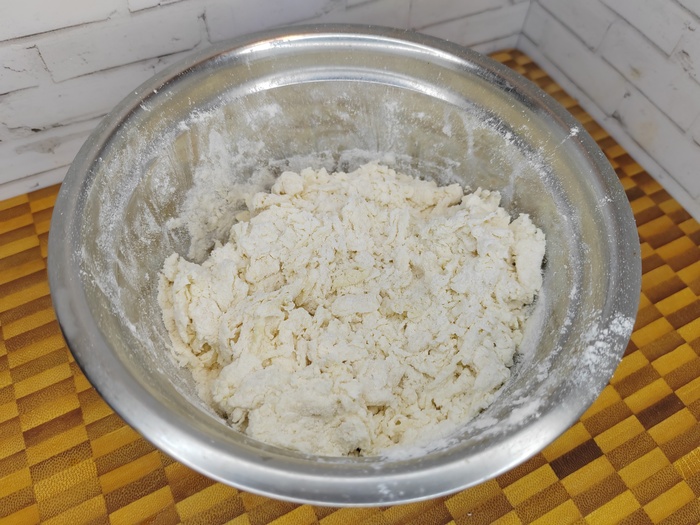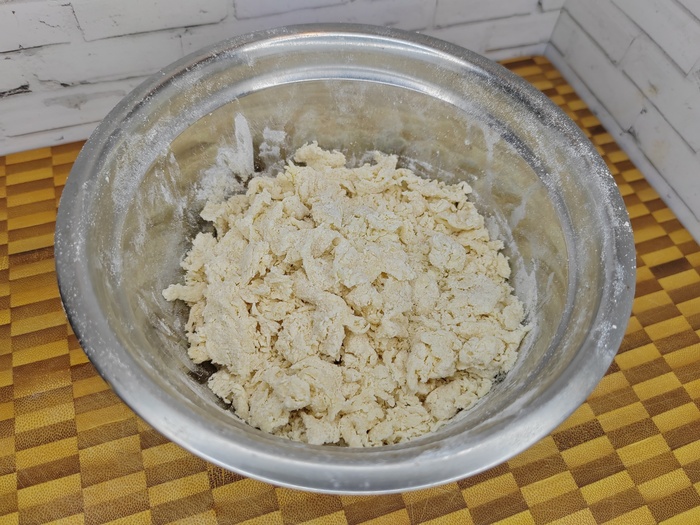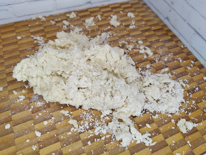 26. Выкладываем получившиеся ошмётки на доску и начнем вымешивать. Тесто весьма крутое. Где-то на семь-восемь Игорей из десяти, где 1 - это бисквитное, а 10 - тесто для рамэнной лапши. Вымешиваем, в общем и даём отдохнуть (лучше в пленке или пакете). Минут 20-30.