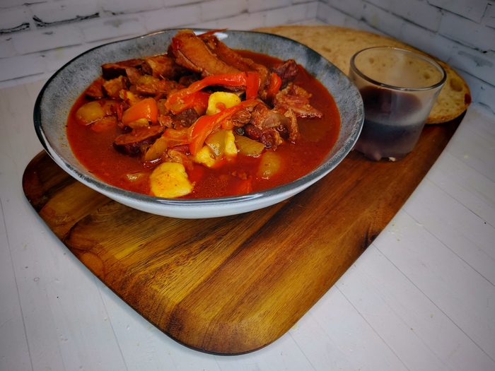 На самом деле, эта вот хряпа, которая у меня получилась может называться и бограчем, и гуляшом, и просто хрючевом, и так далее. Это просто ультрамощный такой завтракообедоужин, одной порции которого может хватить на весь день.