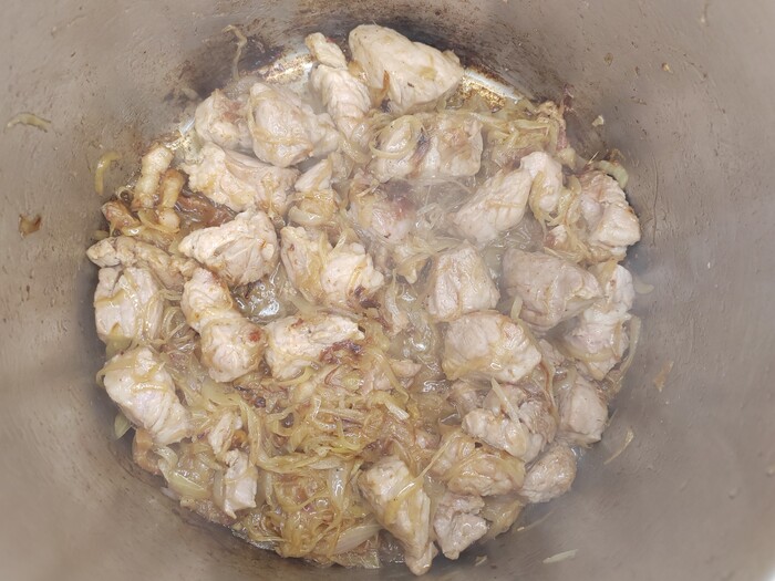 12. Сдвигаем лук к краям, делаем огонь почти максимальным и бахаем в кастрюлю сырую свинью.