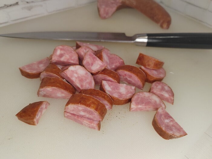 5. Колбасу режем шайбами или полушайбами. Но чтобы тоже ощущалось.