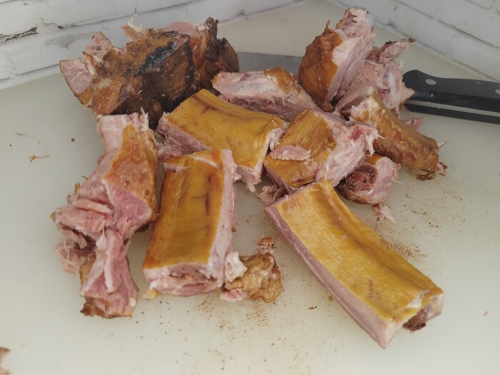 6. Ребра безжалостно рубим на куски, которые можно более менее менее комфортно есть. У меня для этого есть специально обученный нож, который не жалко. Можно топориком воспользоваться. Стоит, кстати, убрать осколки костей.