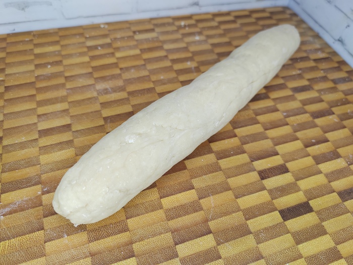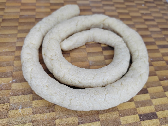 31. Отдохнувшее тесто начинаем раскатывать и растягивать. Сначала в этакую колбаску, а потом в жгут.