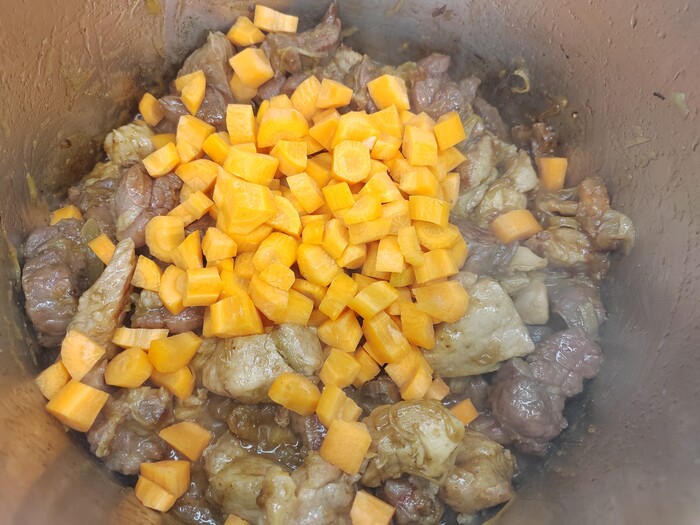 15. Сдвигаем всё в сторону и бахаем в кастрюлю говяду.