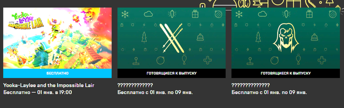 В цифровом магазине Epic Games Store началась раздача игры Yooka-Laylee and the Impossible Lair от студии Playtonic Games, также появились изображения, намекающие на проекты, которые раздаст портал с 1 по 9 января. Судя по одной из них нас ожидает игра из серии Darksiders (а сейчас в EGS есть только третья часть), также ранее появлялись слухи, что одной из игр раздачи станет Kingdom Come: Deliverance. Узнаем точно 1 января в 19.00 по МСК.