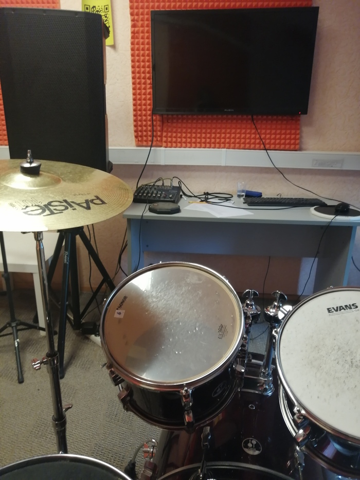 Нас пригласили в кабинет, в нем только барабаны, телевизор, и микрофон. Не вау какой, но уютно (фотография барабана, который был моим учебным местом и обзор с него)