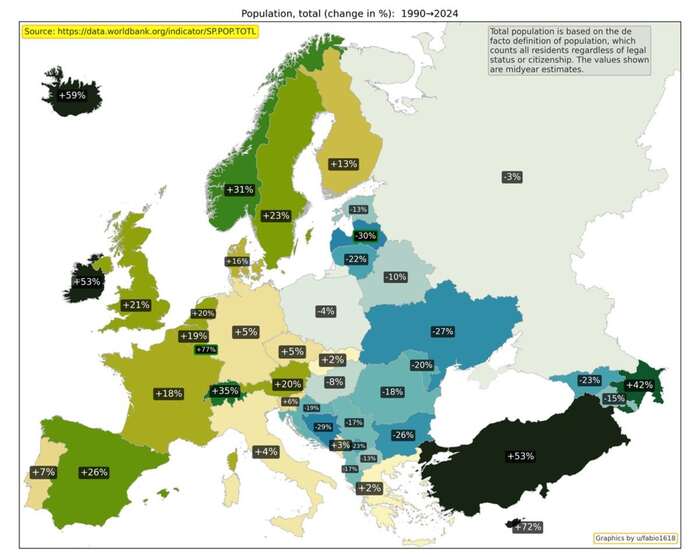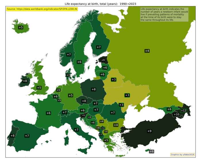 Изменение ожидаемой продолжительности жизни с 1990 по 2023 год /