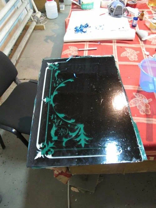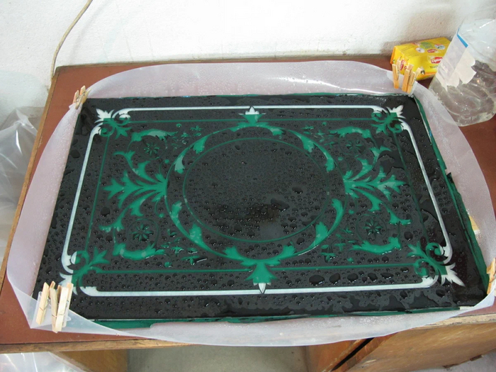 Следующий этап – так называемый «French Embossing». Это техника получения рисунка на стекле с помощью травильного раствора. Ох, и долго я искал его рецепт! Вообще с помощью этой техники можно получать рисунки, в которых будет до шести тонов. Но я буду делать орнамент из двух тонов. Так как в растворе стекло находится длительное время, нужно обезопасить от воздействия раствора те части, которые мы уже затекстурировали и те, которые останутся прозрачными. Если оставить на стекле только шаблон, то его просто смоет со стекла и всё пойдёт насмарку. Поэтому поверх шаблона нужно нанести битумный лак. Вот так неприглядно смотрится стекло после этой операции.