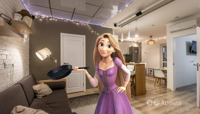 Рапунцель сбежала из башни злой ведьмы, но по-прежнему предпочитает жить повыше. Думаем, что ей подойдет эта уютная «двушка» с огоньками во всех комнатах, милыми деталями, вроде бонсая в кашпо, и проектором, на котором можно смотреть комедии о любви.