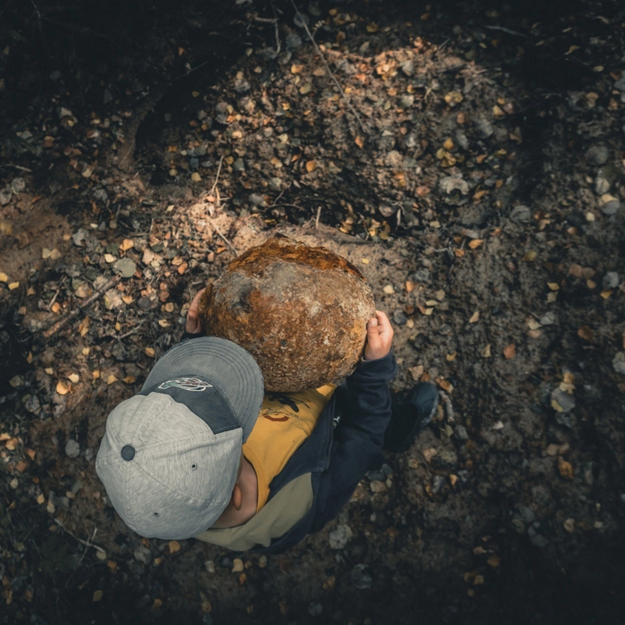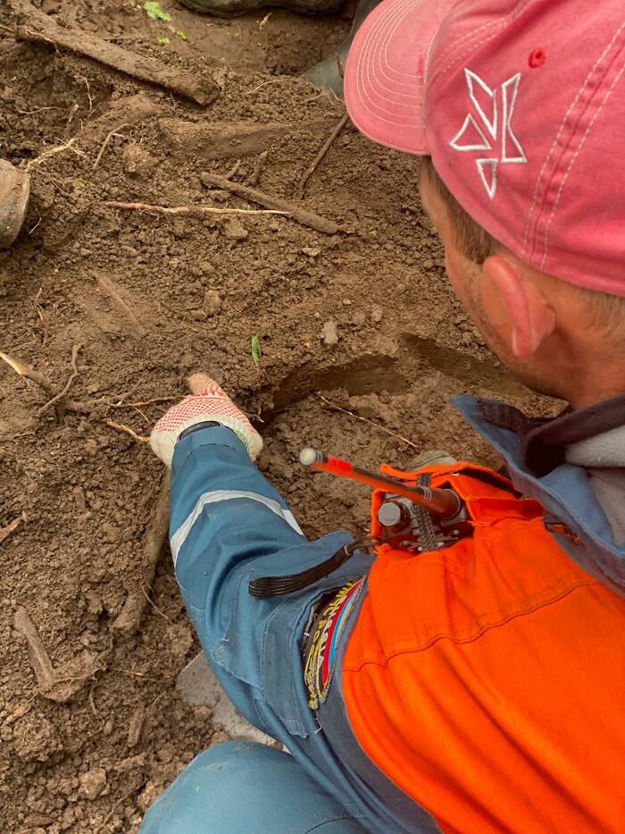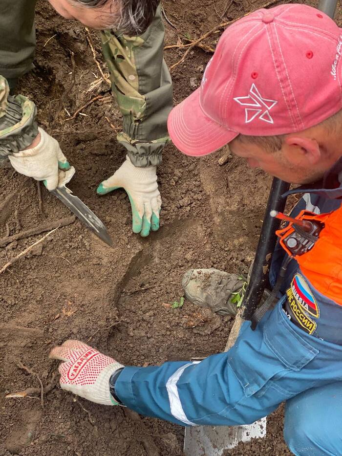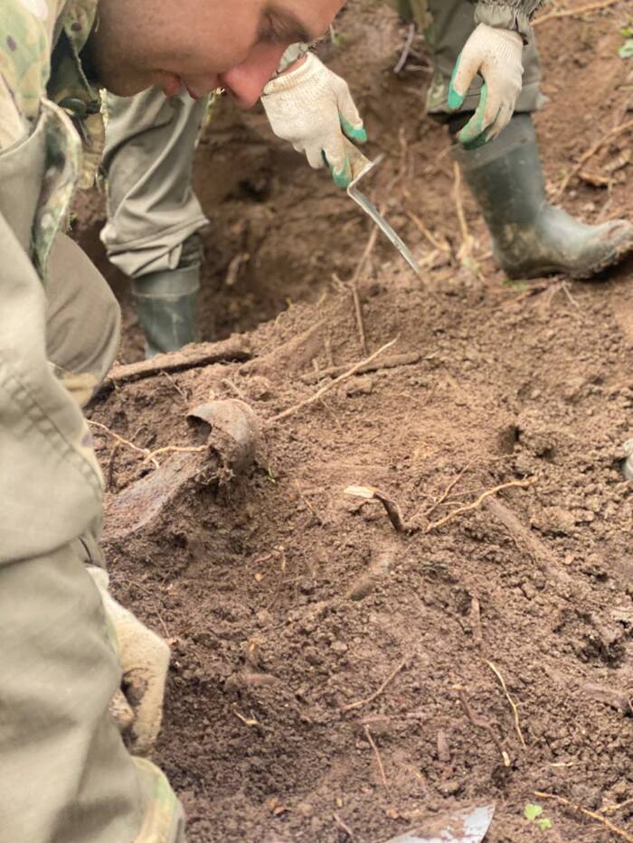 Находим траншею. Она расположена на небольшой, песчаной высоте перед болотом, через которое наступали наши солдаты. Закладываем шурф. Всё дно в немецких гильзах. Пулеметные позиции. Попадаются россыпью гильзы от ППШ, наши заняли траншею? Или немцы использовали трофейное оружие? Натыкаемся на останки. Череп, ребра, ремень который уходит под большой камень. Ремень немецкий. Кости таза, бедренная кость, большеберцовая кость, немецкие ботинки. В траншее убитый немец - не тот, за кем мы приехали...