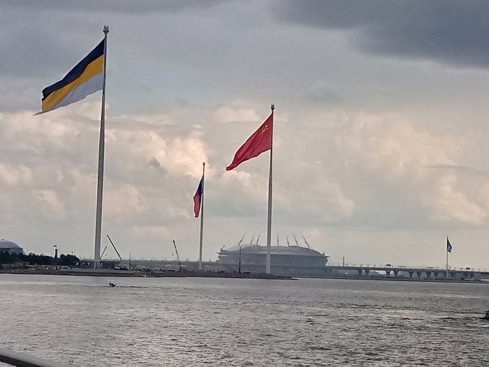 Флаги зафиксированы все четыре, впечатляют, воодушевляют... и заставляют вращаться на горячей сковороде некоторых человеков. А вот в сам парк 300-летия (он же "300-ка", он же "зоолетие") попасть не удалось. VK-фест, подготовка за несколько недель и т.п.