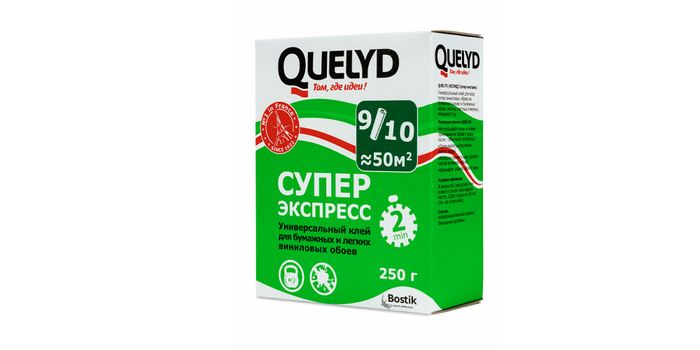 Начинает наш рейтинг французский клей Quelyd Супер Экспресс — один из самых популярных составов для оклейки стен виниловыми, флизелиновыми и бумажными обоями. Этот универсальный клей способен подготовить смесь всего за 3 минуты, а полное время высыхания составляет около 12 часов при стандартной температуре в помещении. Одной упаковки весом 300 граммов хватает на обработку площади до 35 м². клей производится на основе модифицированного крахмала, не содержит вредных добавок, безопасен для использования в жилых помещениях, включая детские комнаты.