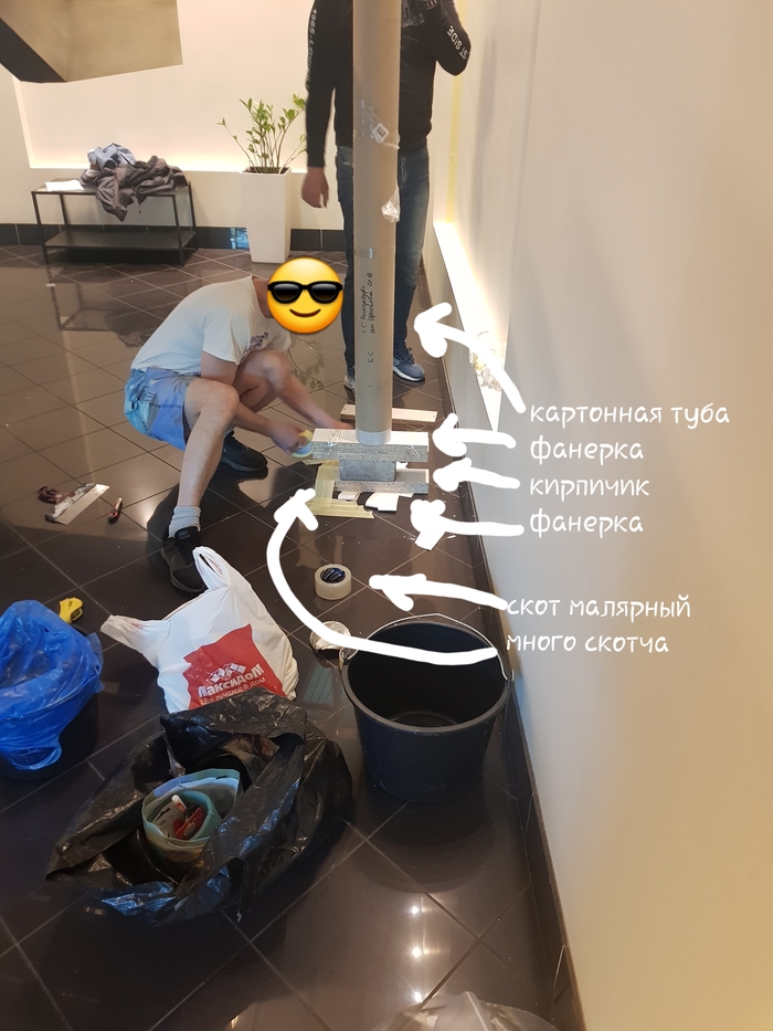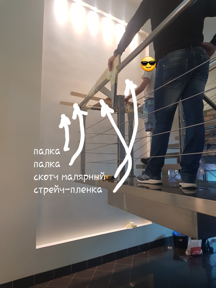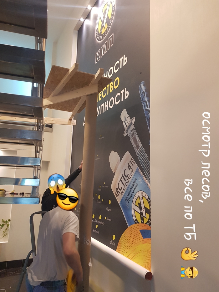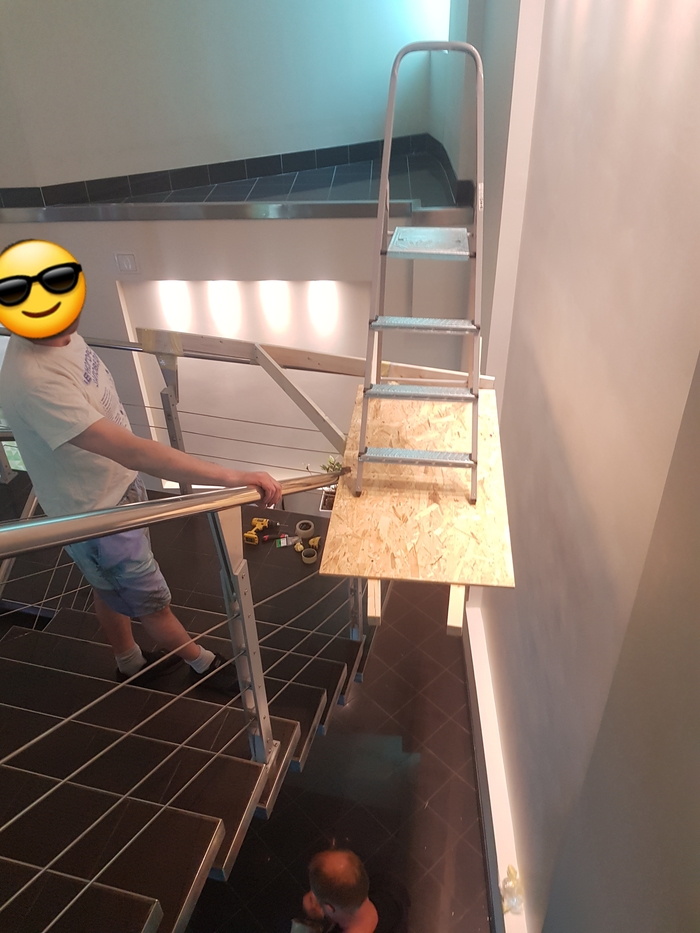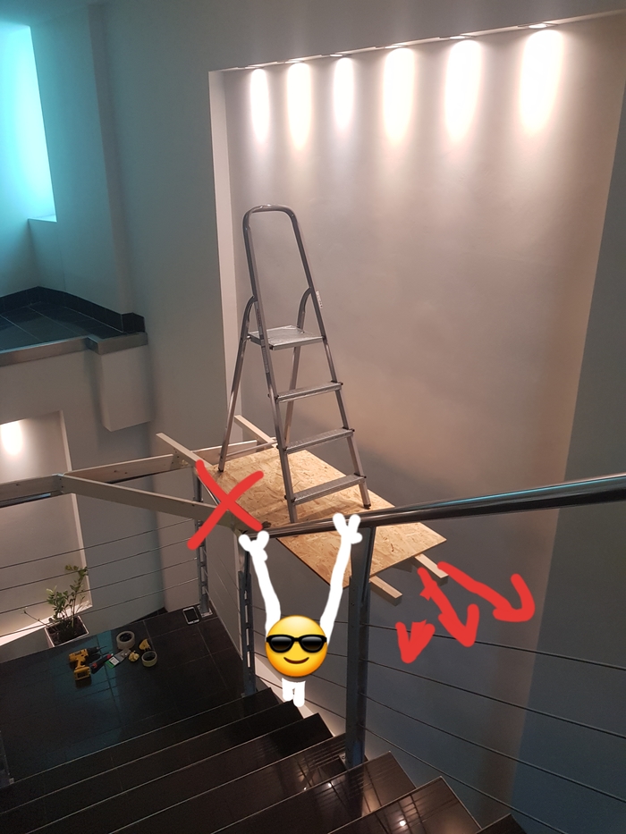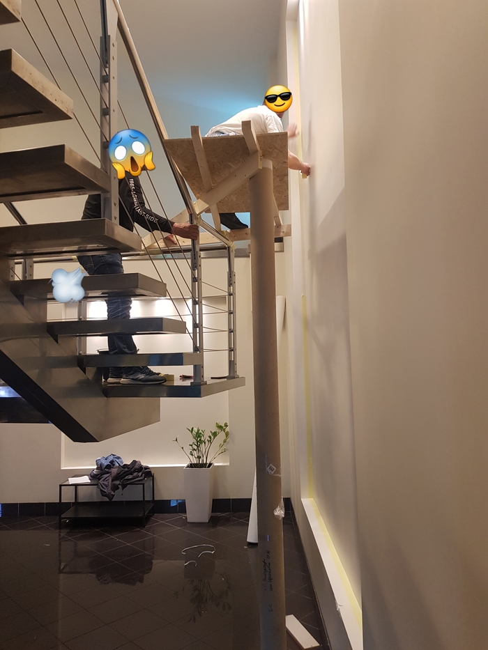 Схема была проста и изящна - примотать стретч-пленкой несколько брусов к перилам хлипкой лестницы и кинуть на них лист фанеры. На получившейся площадке планировалось не только установить стремянку для поклейки фрески но и станцевать после окончания работ (столь надежно было крепление со слов Александра).