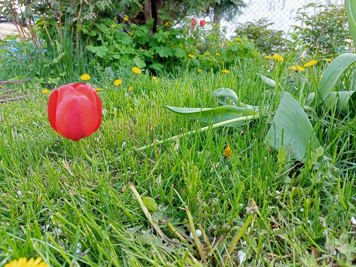 Один из тюльпанов вероломно напал на косу, в неравной схватке был почти перерублен и, разумеется, упал на землю.