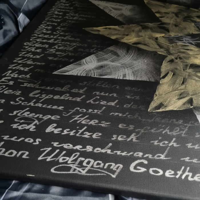 Две фигуры, символизирующие мужское и женское начало, находятся в центре каллиграфутуристического пространства, сотканного из цитат Ю.А.Гагарина и С.П.Королёва