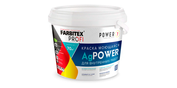 Краска обладает высокой укрывистостью и образует прочное матовое покрытие, устойчивое к многократному мытью и истиранию. Время высыхания между слоями — от 1 до 2 часов, полное высыхание — до 7 суток. Farbitex Profi AgPower легко наносится кистью, валиком или распылителем, не образуя подтёков и разводов. Белая база подходит для колеровки в светлые оттенки, что позволяет подобрать нужный цвет для любого интерьера. Продукт экологически чистый, гипоаллергенный и не имеет запаха.