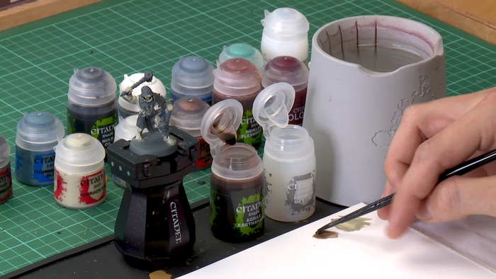Теперь пора добавить затенения, которые помогут лучше очертить рельеф кожи Легионера. Работаем коричневой проливкой Agrax Earthshade
