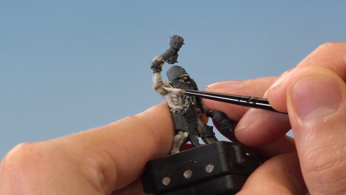 Это хорошая подложка для металлических элементов модели и бледной кожи, создание которой начнётся с нанесения светло-бежевой базовой краски Ionrach Skin