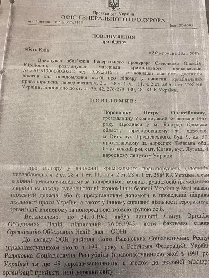 По данным источников "Страны", правоохранители отправили "пидозру" Петру Порошенко по почте, что свидетельствует о том, что Порошенко считается уведомленным. Допрос Порошенко должен состояться в Киеве 23 декабря.